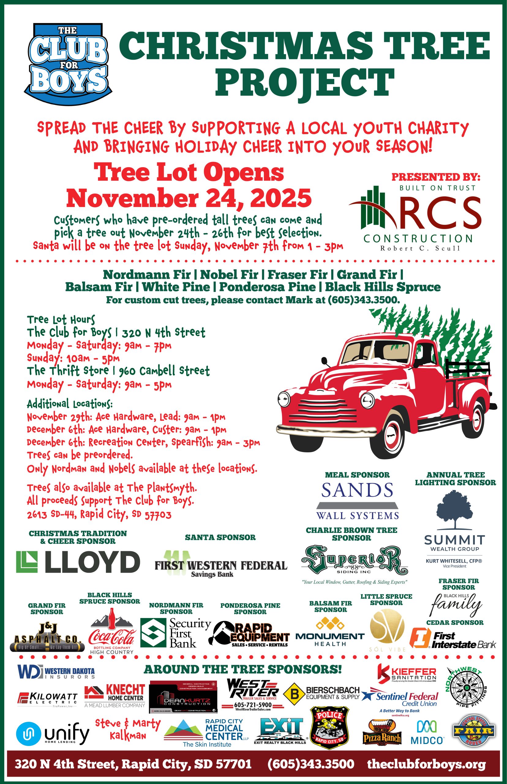The Club for Boys Christmas Tree Lot will open for the 2025 season on November 24, 2025.
