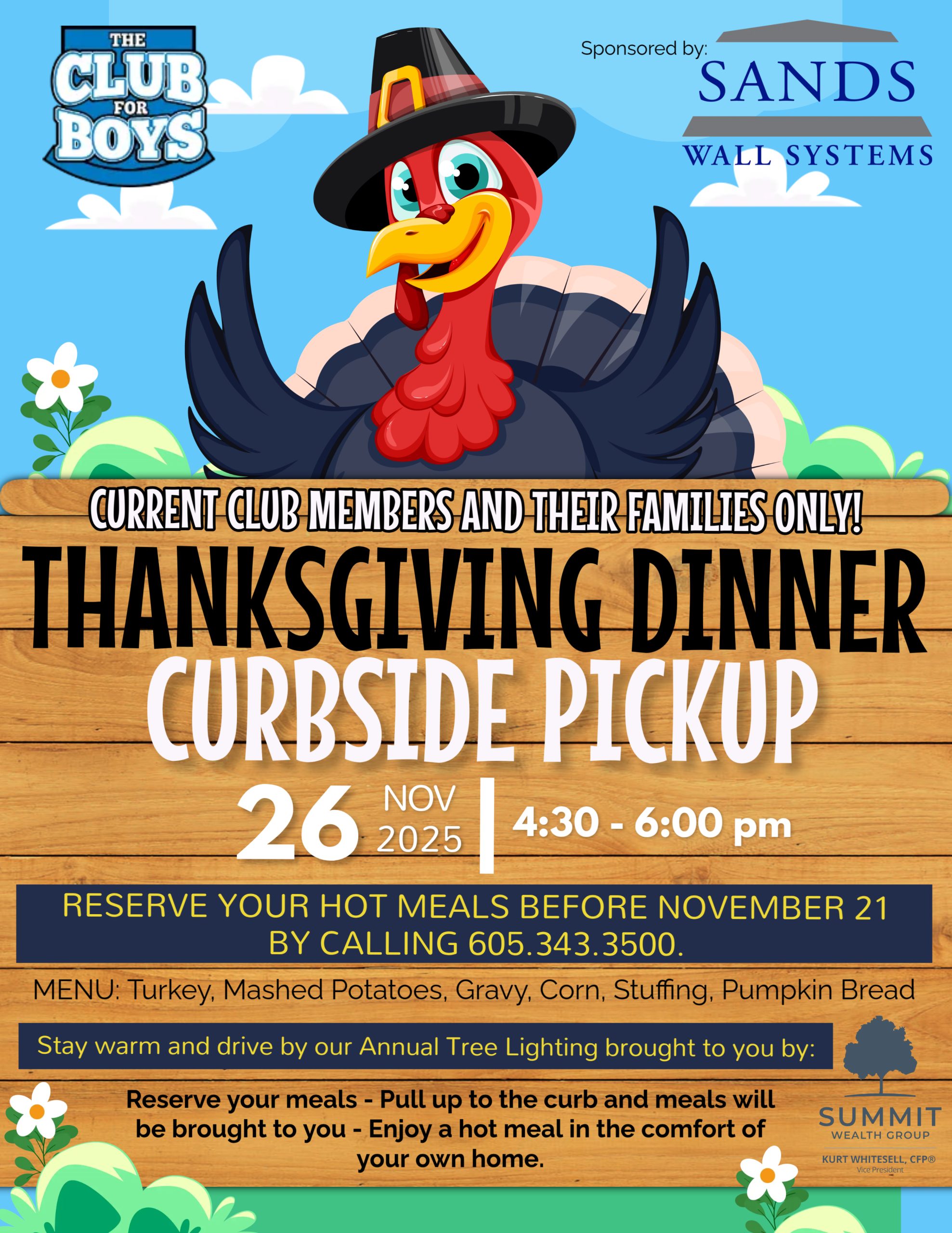 November 26 @ 4:30 pm - 6:00 pm Curbside Thanksgiving Dinner The Club for Boys 320 N 4th St, Rapid City, SD, United States